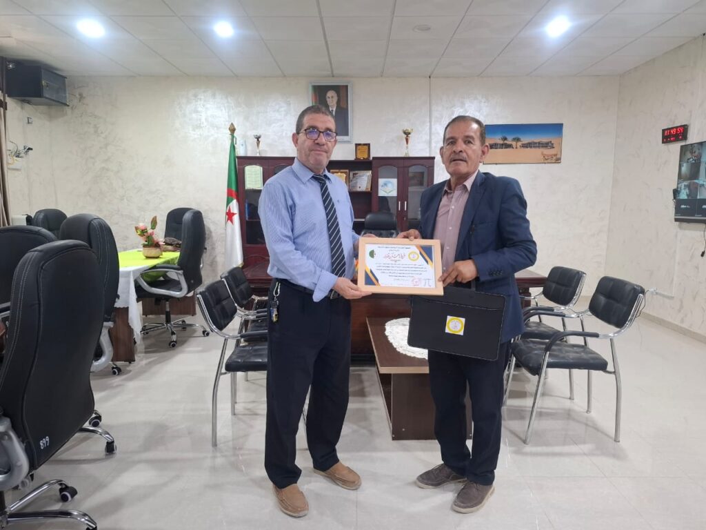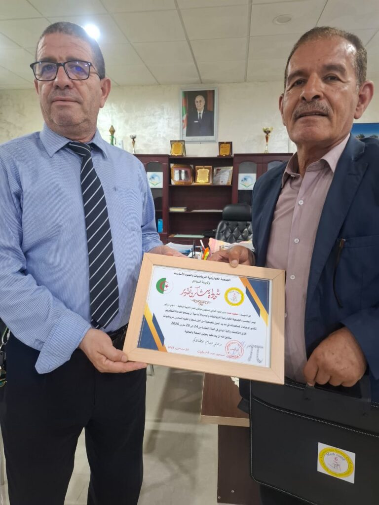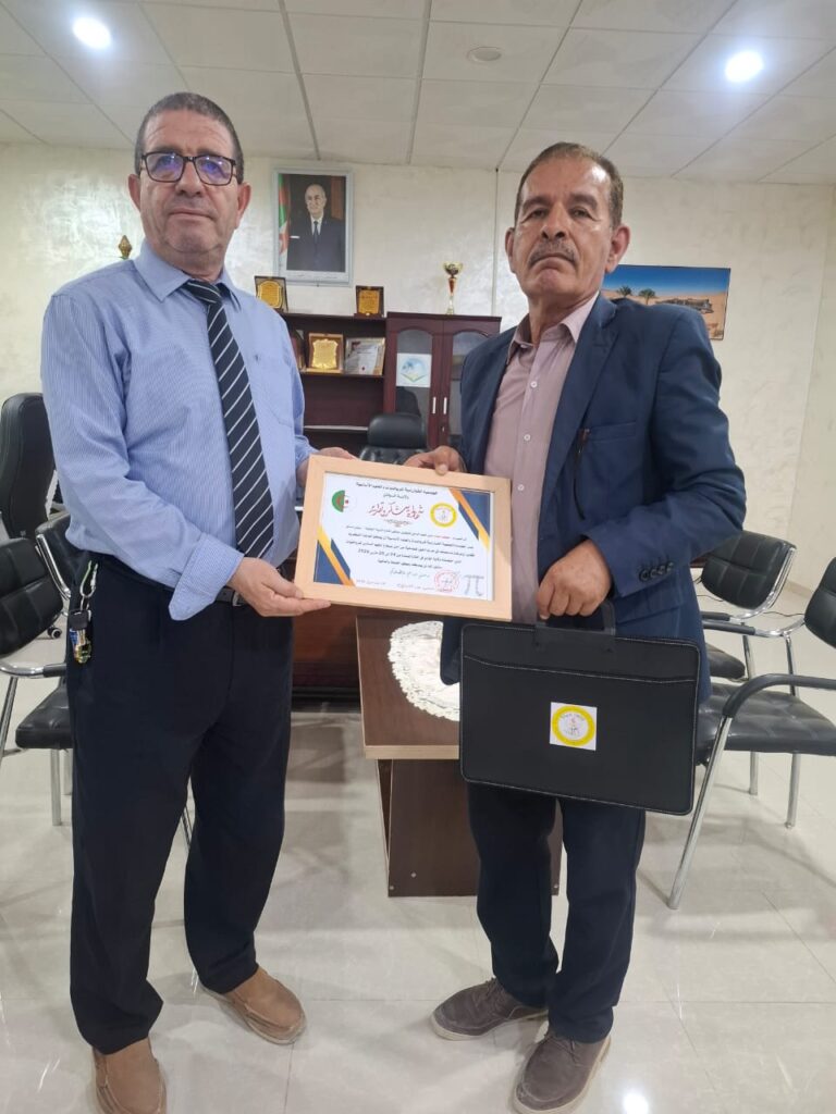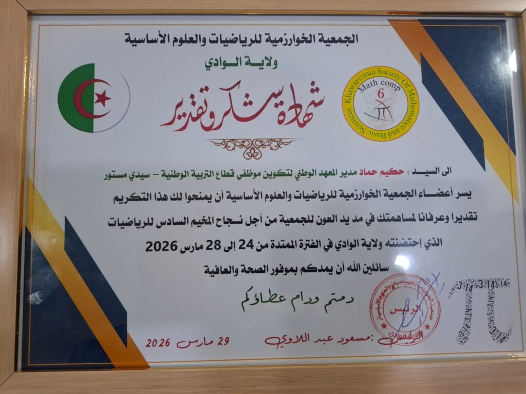 Ce mardi 21 avril 2026, Monsieur le Directeur de l’Institut a été honoré par le Président de l’Association Al-Khwarizmi pour les Mathématiques et les Sciences Fondamentales. Cette distinction vient en reconnaissance de sa contribution active au succès du 6ème Camp de Mathématiques, qui s’est tenu récemment dans la wilaya d’El Oued (du 24 au 28 mars), et en appréciation de l’esprit de coopération dont il a fait preuve pour soutenir les activités de l’association.